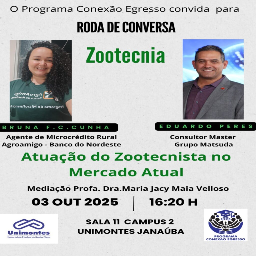 A Universidade Estadual de Montes Claros (Unimontes), por meio do Programa Conexão Egresso, convida para a Roda de Conversa em Zootecnia, que acontecerá no âmbito do 1º Encontro da Pecuária Leiteira do Semiárido Mineiro.