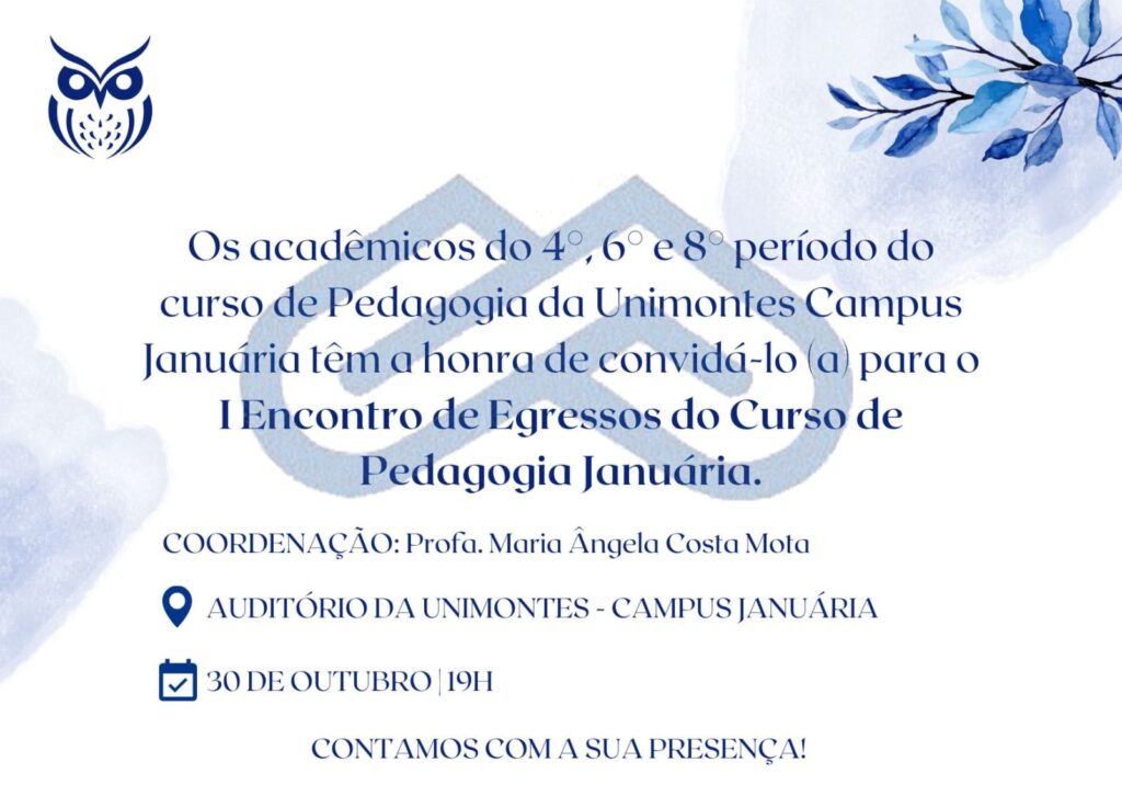 Os acadêmicos do 4º, 6º e 8º períodos do curso de Pedagogia da Unimontes – Campus Januária têm a honra de convidar os(as) egressos(as) para o I Encontro de Egressos do Curso de Pedagogia.