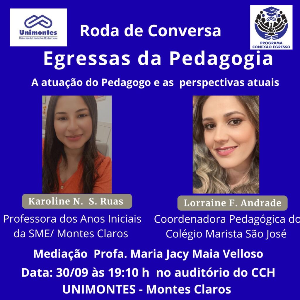 A Universidade Estadual de Montes Claros (Unimontes), por meio do Programa Conexão Egresso, promove a Roda de Conversa “Egressas da Pedagogia: A atuação do pedagogo e as perspectivas atuais”.